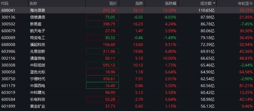 芯片巨头海光信息持续拉升,盘中涨超15%,截至发稿,成交金额突破110亿元,为A股第一,市值突破6800亿元。澜起科技、国芯科技、芯原股份、东芯股份跟涨。