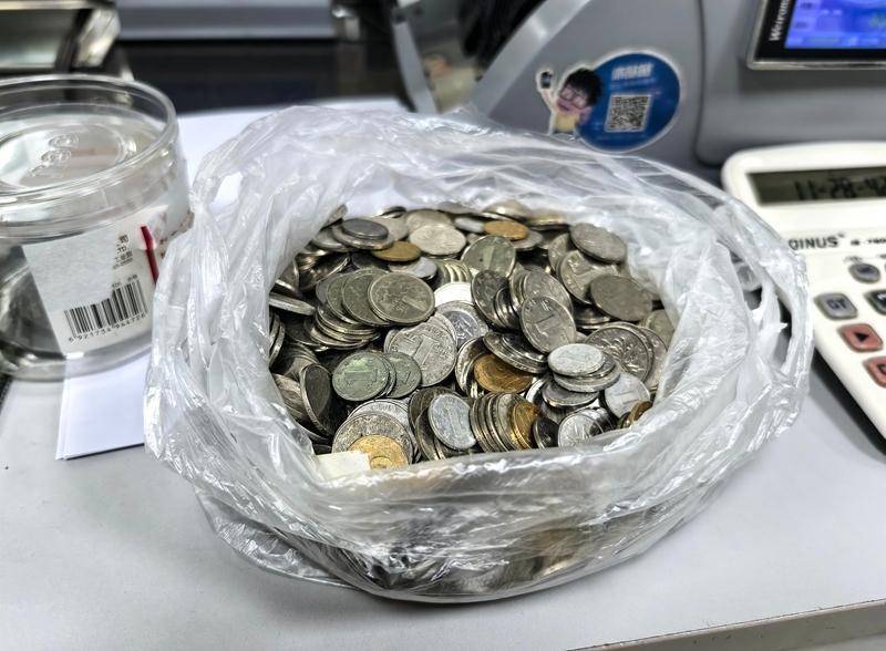 工作人员清点硬币。