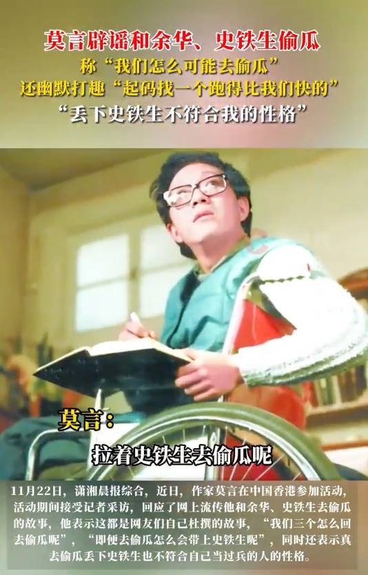 据此前报道,2025年11月,作家莫言在中国香港参加活动时,回应了网上流传他和余华、史铁生去偷瓜的故事,他表示这都是网友们自己杜撰的故事,“我们三个怎么会去偷瓜呢?”“即便去偷瓜怎么会带上史铁生呢?”,同时还表示,真去偷瓜丢下史铁生也不符合自己当过兵的人的性格。
