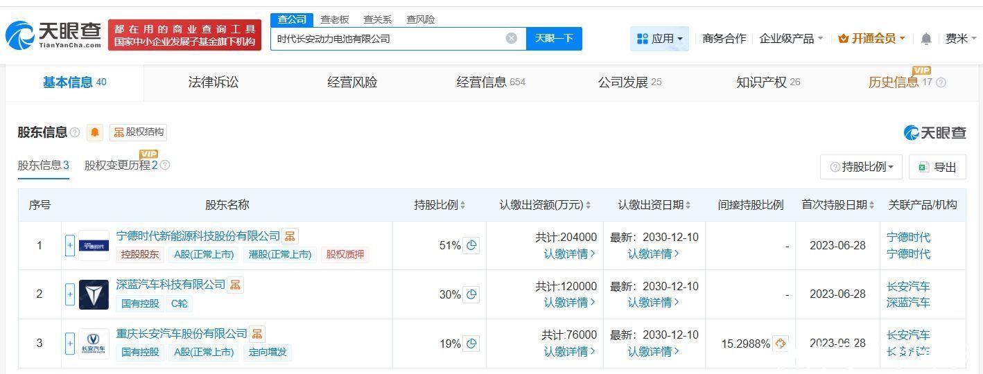 时代长安动力电池有限公司成立于2023年6月,法定代表人为朱云峰,经营范围包括电池制造、电池销售、新兴能源技术研发、新材料技术研发等。股东信息显示,该公司由宁德时代(300750)、深蓝汽车科技有限公司、长安汽车(000625)共同持股。