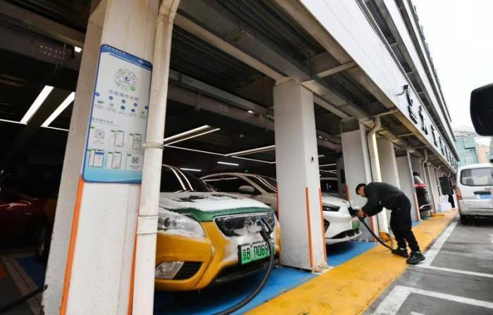 新能源车正在超级充电站内充电。
