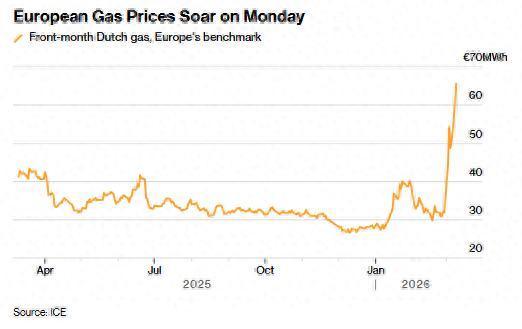 智通财经APP获悉,随着中东战事持续扰乱能源市场、阻断海运供应,欧洲天然气价格应声暴涨。周一基准天然气期货价格一度飙升30%,延续了自能源危机以来最大单周涨幅。与此同时,由于多个主要中东产油国减产,霍尔木兹海峡持续关闭,国际油价已突破每桶100美元大关。美国天然气期货价格同样走高,触及一个月来最高点。