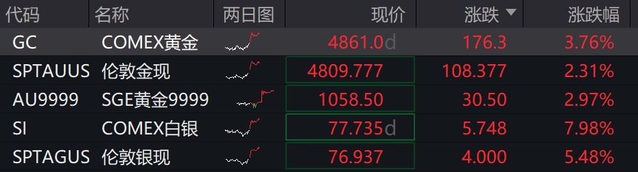 白银表现更为抢眼,伦敦现货白银报每盎司76.9美元,日内涨幅超5%;纽约期银(COMEX 白银)报77.74美元/盎司,单日大涨7.98%。