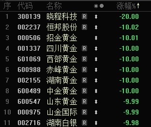 晓程科技跌20%,招金黄金、四川黄金、湖南黄金、山东黄金等10只个股跌10%。